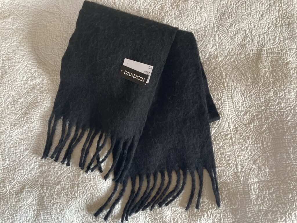 黒はH&Mの起毛マフラーを今年は買いました。H&Mの中でもストリート性が高いDIVIDEDのものでポリエステル 100%のバルキーな素材感。幅は27㎝ですが長さは220㎝もあり、かなりな巻き応えです。ですが軽くて暖かい!定価は1999円でしたがセールで(確か1299円)買いました。今は白(クリーム)しか残っていないようです。