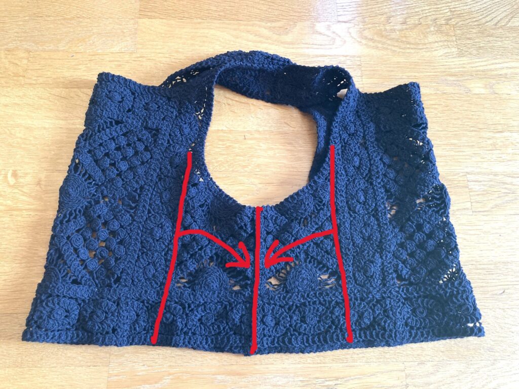 今回は模様編みのキャミソールでしたが、無理に模様編みである必要はありません。無地のニットのでも対応できますし、着丈が長い場合は内側に折り込んで裏地のような状態に仕上げても良いでしょう。それが面倒ならカットしても良いです。カットした布はポケットにしても可愛いですね。