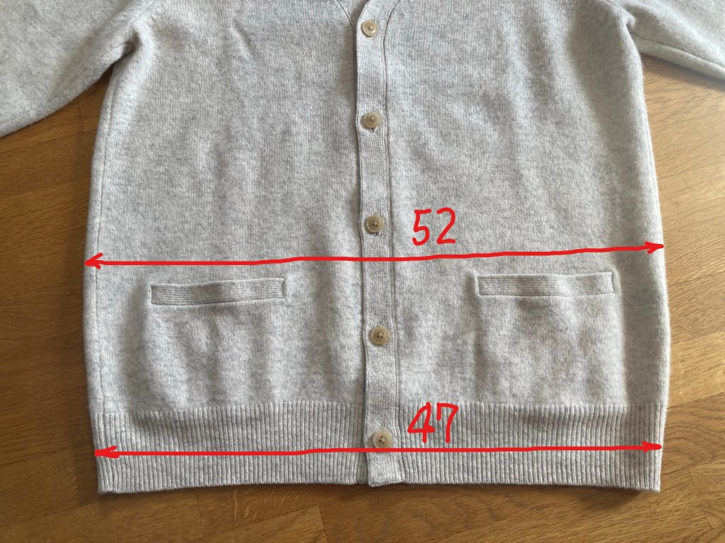 下の写真をご覧ください。このカーディガンの着丈は73㎝ですが、裾(すそ)部分の幅は47㎝。つまり着用した場合の周径は94㎝となります。