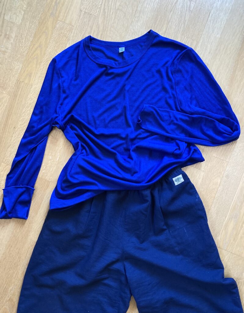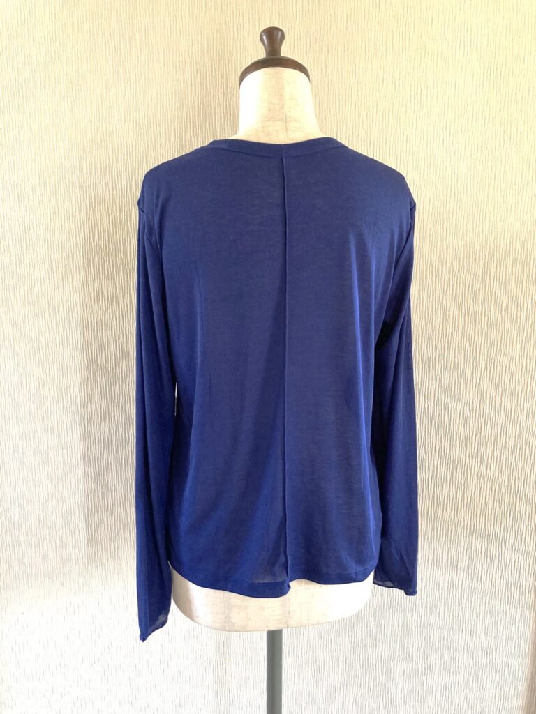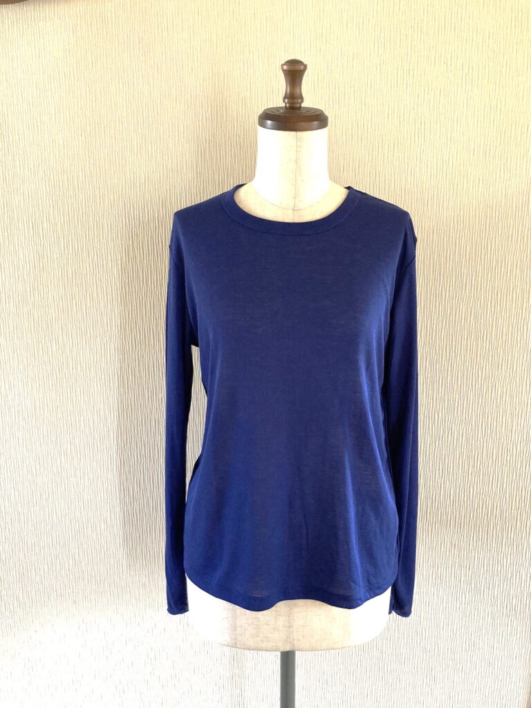 もっと寒くなったらセーターの下に着て、首回りや袖口からチラッと青を覗かせるのも楽しいかもしれません。袖丈も長めです。