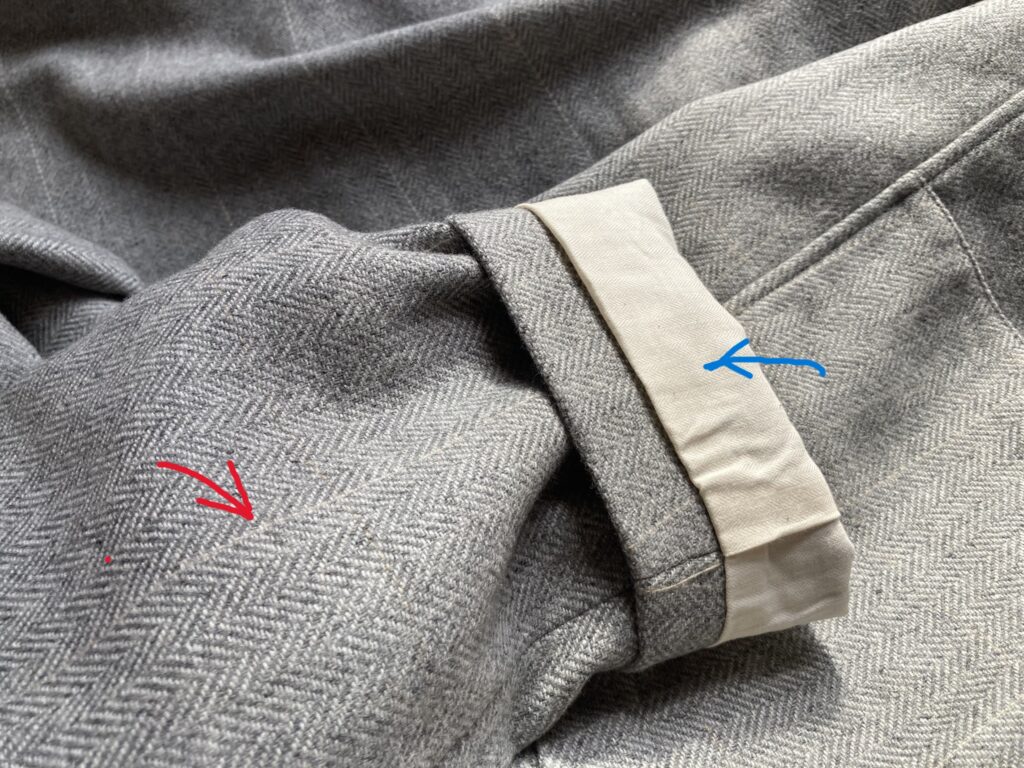 袖も内側に折って着ています。外側に折り返して着る人もあるようですが(青矢印)、私は袖裏の白が目立つのでそれはしません。ヘリンボーン生地には白線が7~8cm間隔で入っていて控えめなアクセントになっています(赤矢印)。